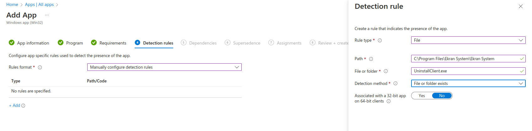 8. On the Detection rules tab, select Manually configure detection rules in the Rules format drop-down menu, and then click + Add to add a detection rule, and select the following values in the corresponding fields in the Detection rule pane (on the right):