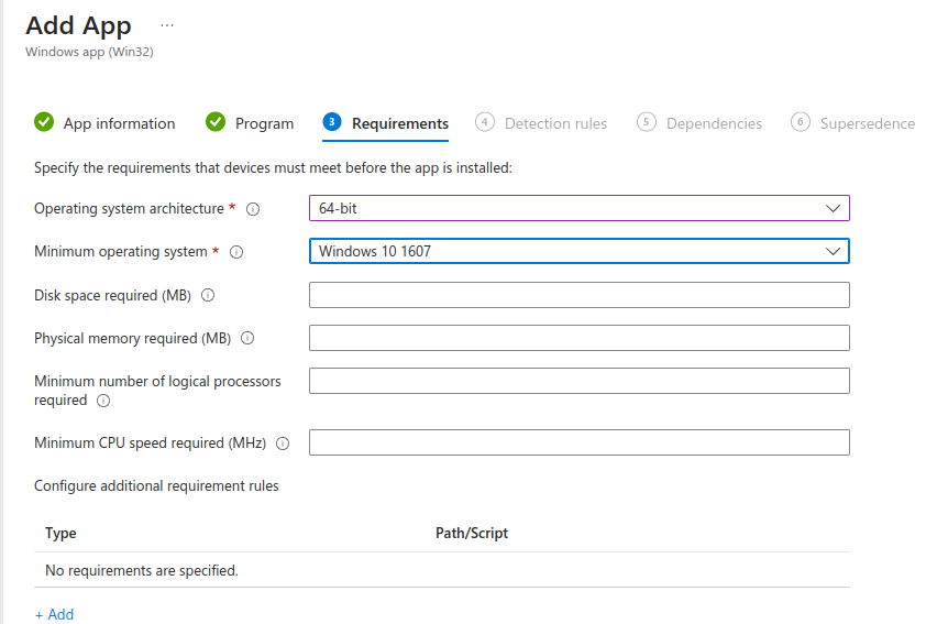 7. On the Requirements tab, select the following values in the corresponding fields, and then click Next.