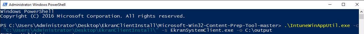 .\IntuneWinAppUtil.exe -c "C:\Users\Administrator\Desktop\SytecaClientInstall\" -s SytecaClient.exe -o C:\output