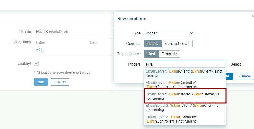 3. Enter a Name for the action (e.g. in this case "EkranServerIsDown", as shown in the screenshot below), and select the following Trigger for when the EkranServer service is not running: "EkranServer: "EkranServer" (EkranServer): is not running".