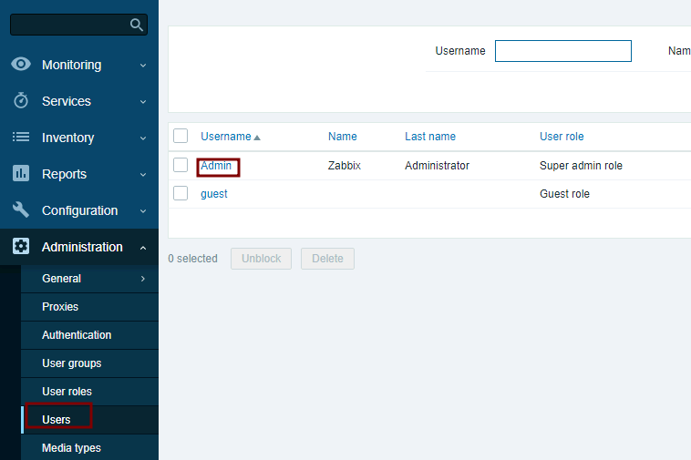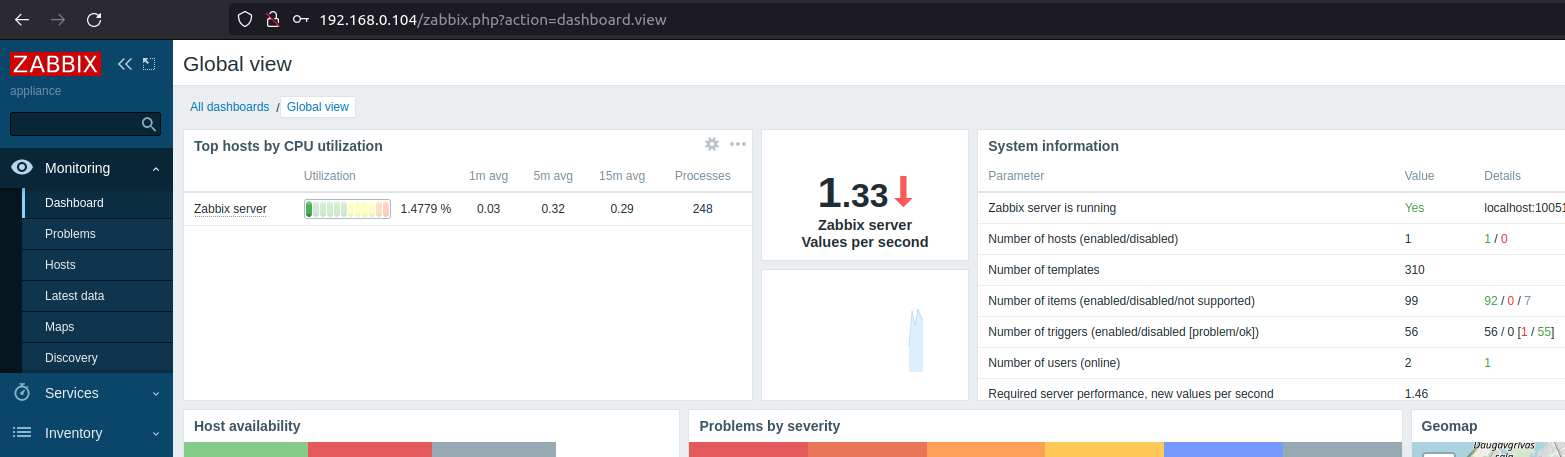 3. Log in to the Zabbix frontend in a browser, by using the IP address of the machine on which Zabbix server is installed, and the following default credentials: