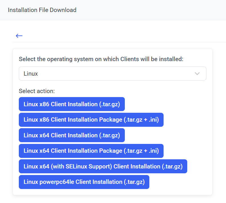 - Linux Client x86/x64 Installation Package (.tar.gz+.ini): To generate an installation package while defining the Linux Client configuration parameters to be used for installing it (see Point 6 below).