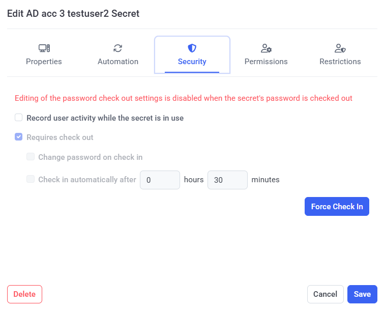 - Force Check In (button): If the Requires check out checkbox is selected, and the secret is currently being used, this button can be clicked at any time to manually check the secret's password back in (i.e. to forcibly disconnect the current user of the account that the secret is currently accessing) immediately.