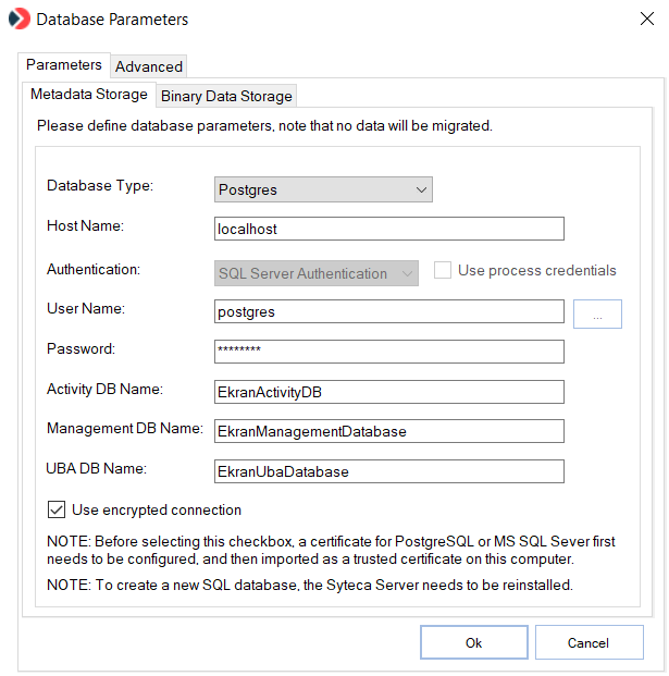 NOTE: Before selecting this checkbox, a certificate for the database server first needs to be configured, and then imported as a trusted certificate on this computer.