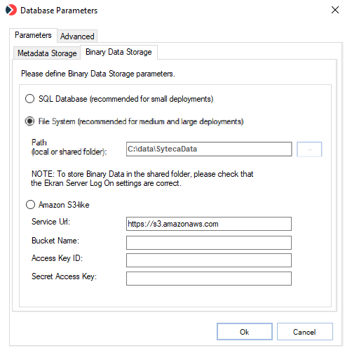 • For medium-sized and large deployments, the Amazon S3-like storage option can be selected to store the binary data received from Clients in an existing Amazon S3 storage location, and then define the parameters to access the S3 storage location. More information can be found on the Configuring Syteca to Store Binary Data in Amazon S3 page.