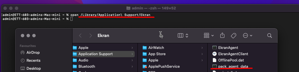 2. Use the following command to open the folder where you can find the pack_agent_data.sh tool, which can then be used to create the Client logs locally in: open /Libraries/Applications\ Support/ Ekran