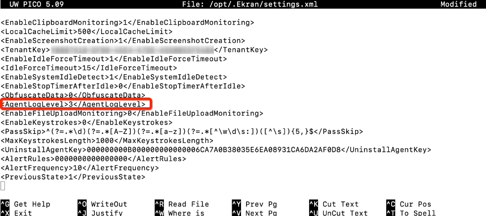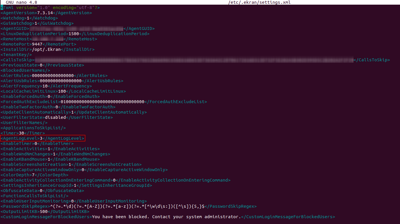 2. Use the following command to open the settings.xml file: sudo nano /opt/.Ekran/settings.xml.