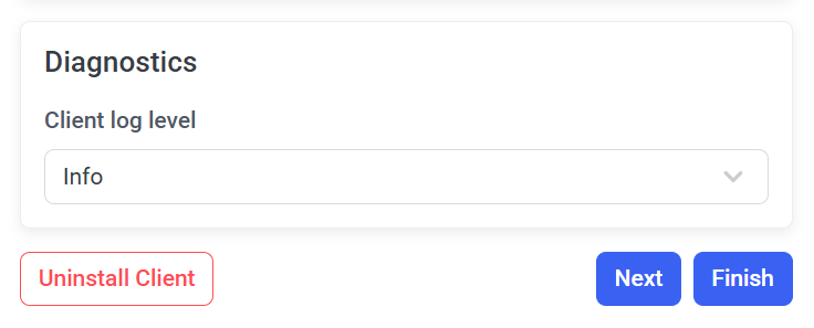 To define the level of the log entries to be saved to the Client log files, open the Clients page, click on the name of the required Client computer, and then on the Editing Client page, select the Properties tab, and scroll down to the Diagnostics section (at the bottom).