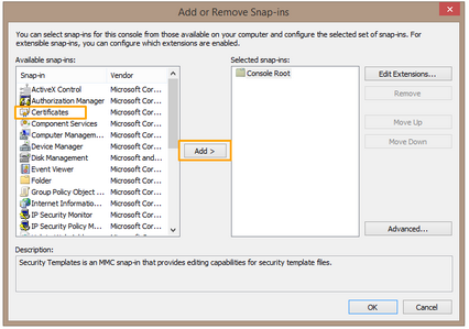 4. In the Add or Remove Snap-ins window, select Certificates and click Add button in the center.