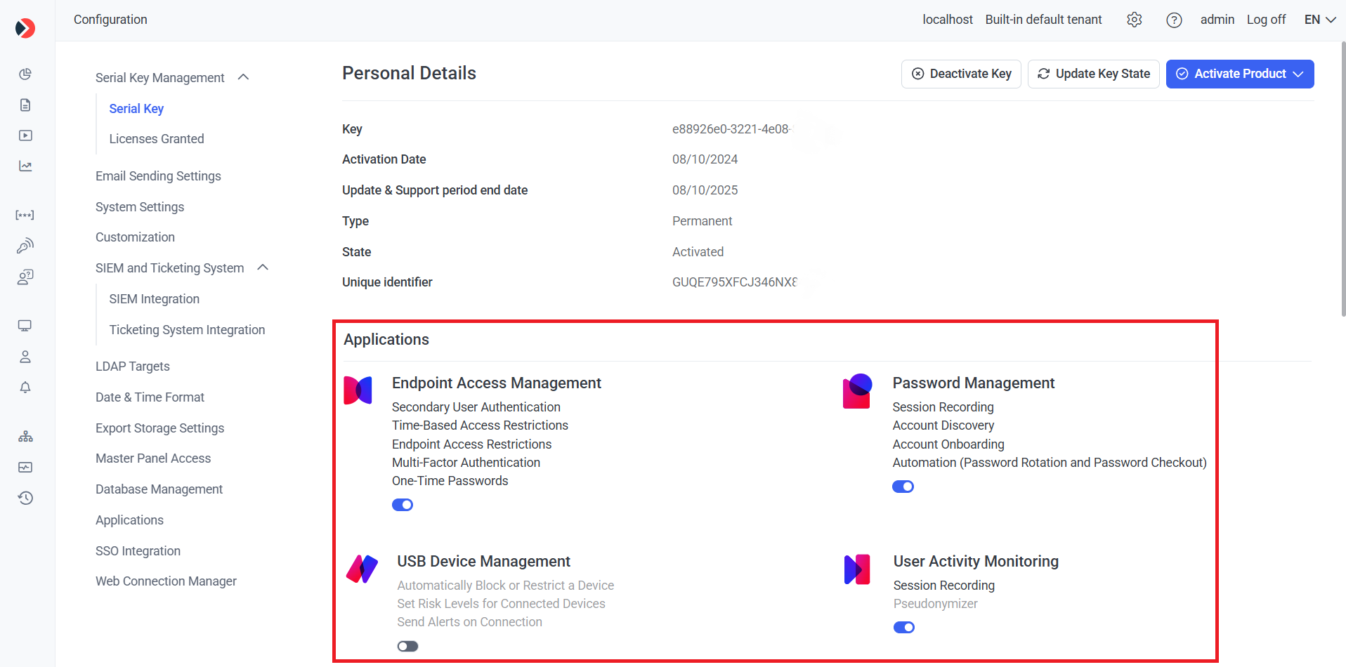 NOTE: The toggles for the applications, and the features displayed in gray, can only be enabled (or disabled) by contacting your product vendor to update your serial key.