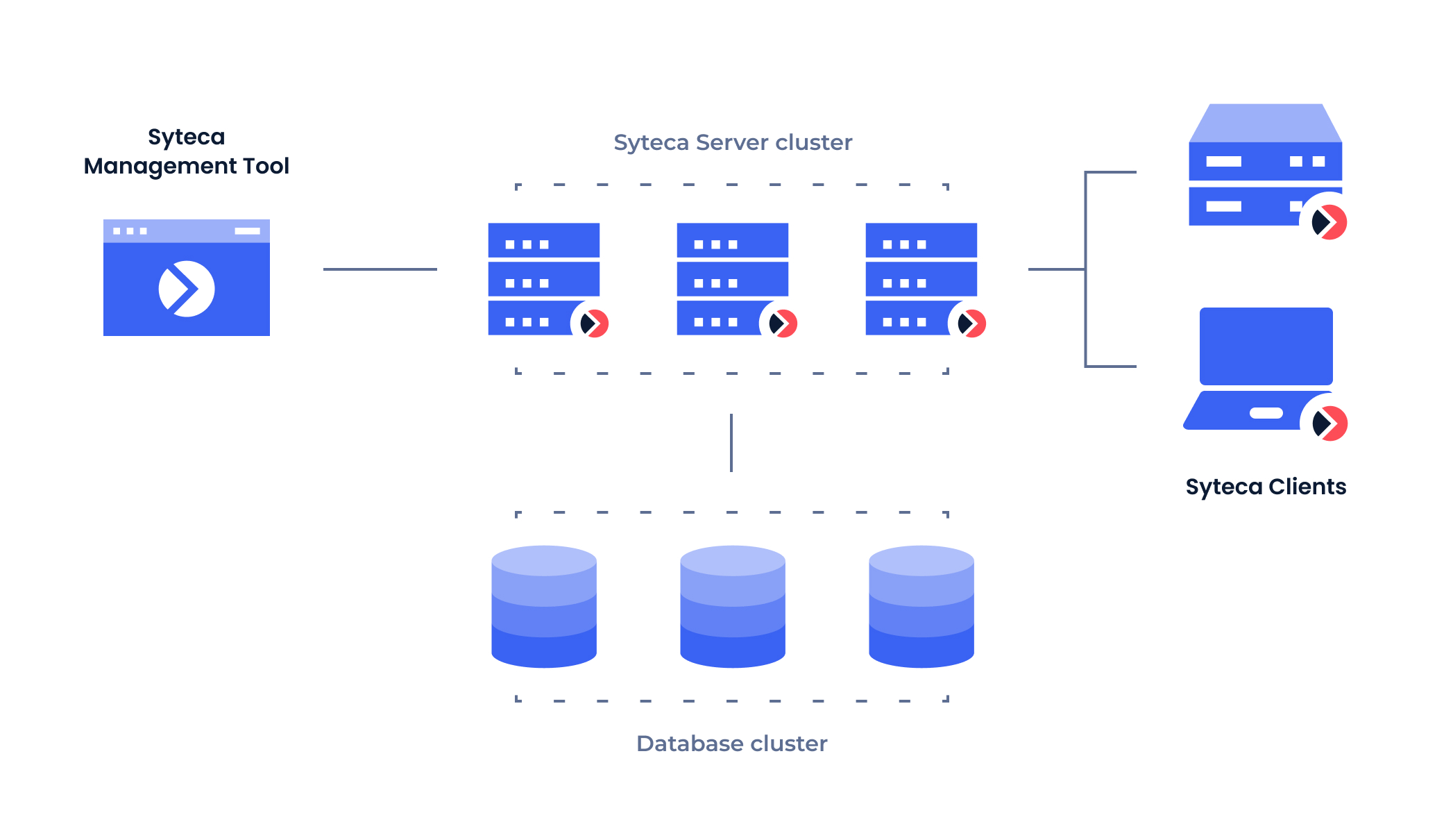 High Availability mode allows you to configure and deploy Syteca in such a way that it can operate with multiple Application Server instances installed on different nodes in a Microsoft failover cluster. This provides for load balancing of data sent to the Application Servers by Syteca Clients to optimize performance, and ensures data integrity in case any of the instances go offline for any reason by using a backup Application Server for disaster recovery.
