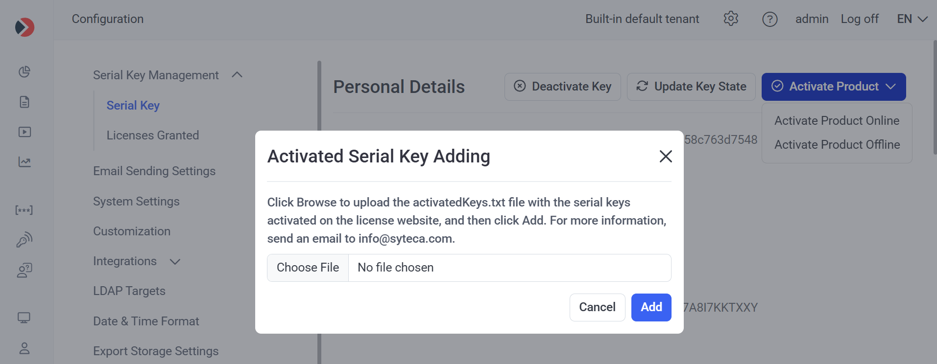 NOTE: To get the file with the offline activation key, please contact your partner or the Syteca Support team.