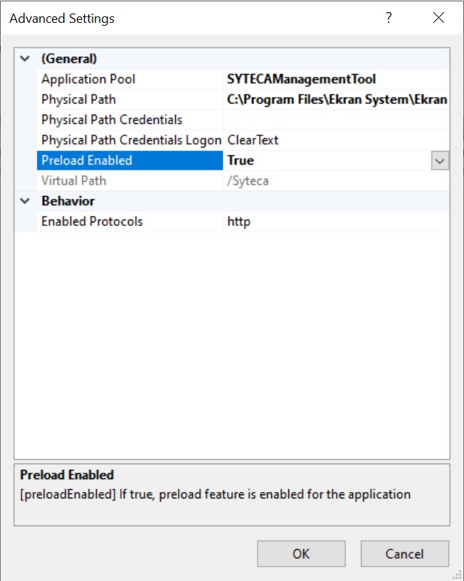 3. Set Preload Enabled to "True" for the Syteca application, by doing the following: