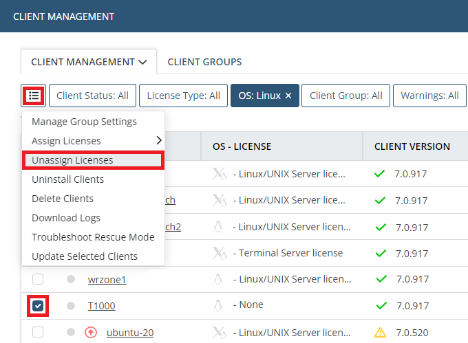 9. Re-assign the license to the Linux Client machine (on the Clients page).