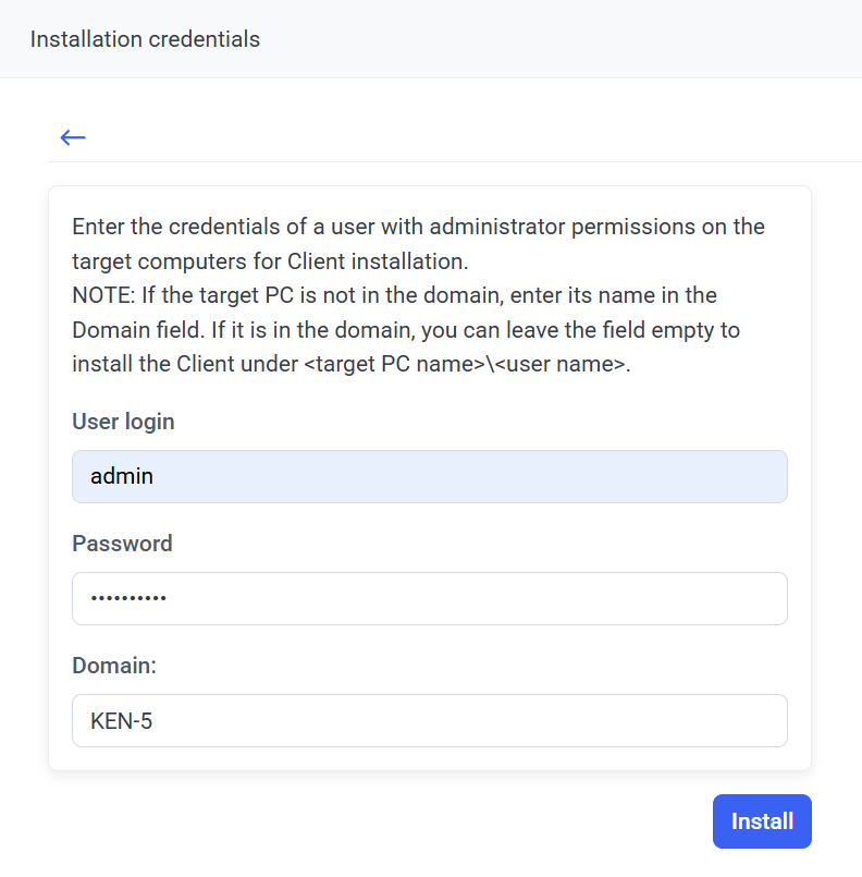 NOTE: If you leave the Domain field empty, the credentials entered will be used as the credentials of the local user of the target computer and the Client will be installed under the <target PC name>\<user name> account.