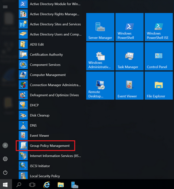 2. In the domain controller, use the Windows Start menu, to open Administrative Tools, and click Group Policy Management.