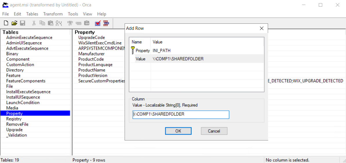 1. Right-click the agent.msi file, and select Edit with Orca in the context menu.