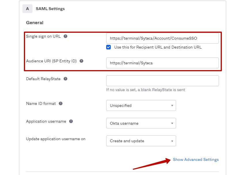 4. On the Configure SAML page, fill out the Single sign on URL and Audience URI (SP Entity ID) fields (i.e. replace the example "https://terminal/Syteca/" part of the URL shown in the screenshot below, with the URL of your Management Tool in both fields).