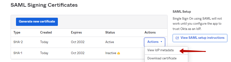 7. After finalizing configuration of the SAML integration, scroll down to the SAML Signing Certificates section (on the Applications > Application > <your application> > Sign On page), and then click the Action button next to SHA-2, and select View IdP metadata in the drop-down list.