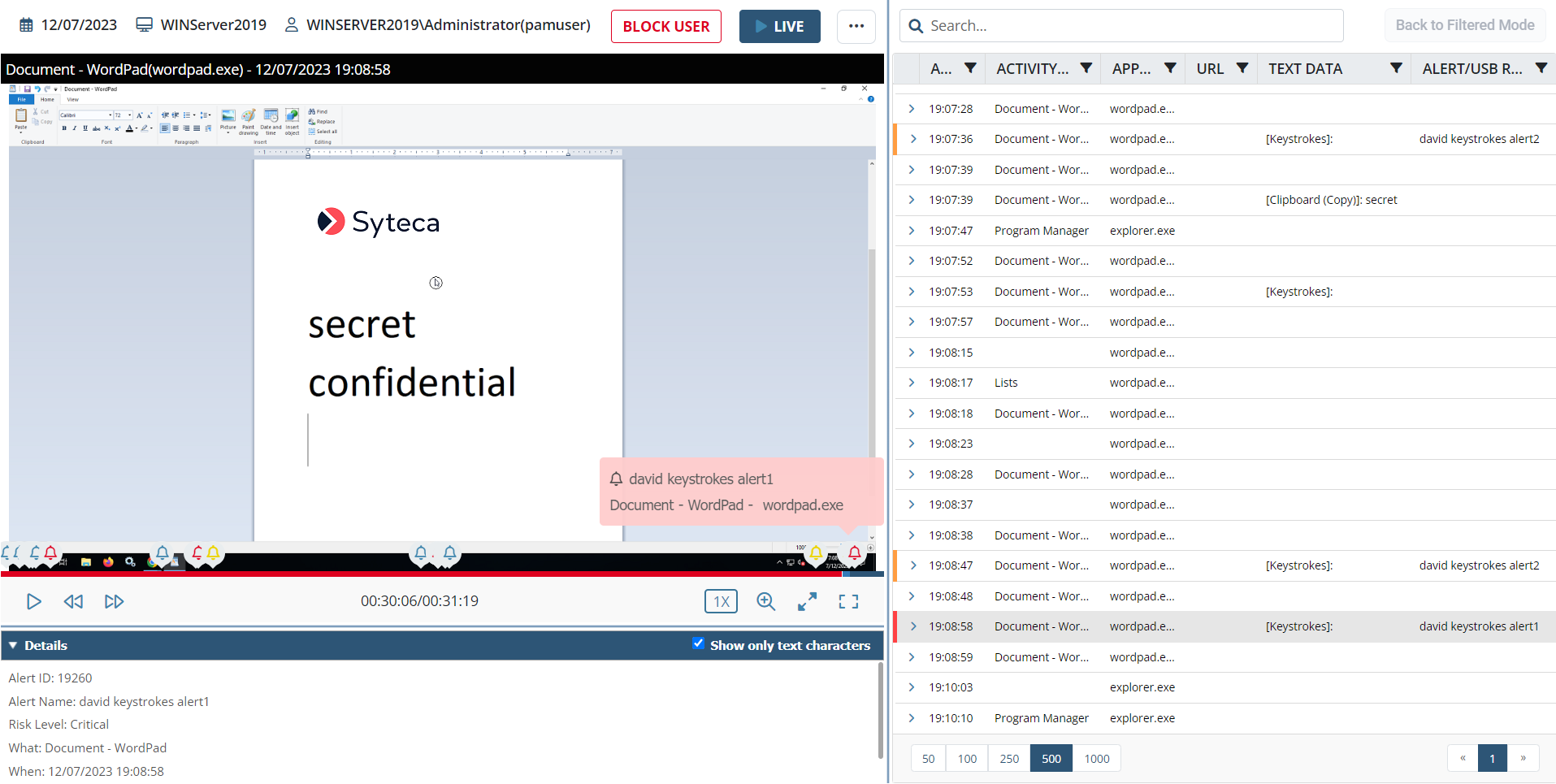 Syteca allows keystroke logging to be enabled to assist in the detection of malicious insiders and protect your sensitive data on the endpoints. In addition, to get information only on potentially-suspicious activities, you can enable the recording of user activity to be started automatically on detection of specific keywords typed.