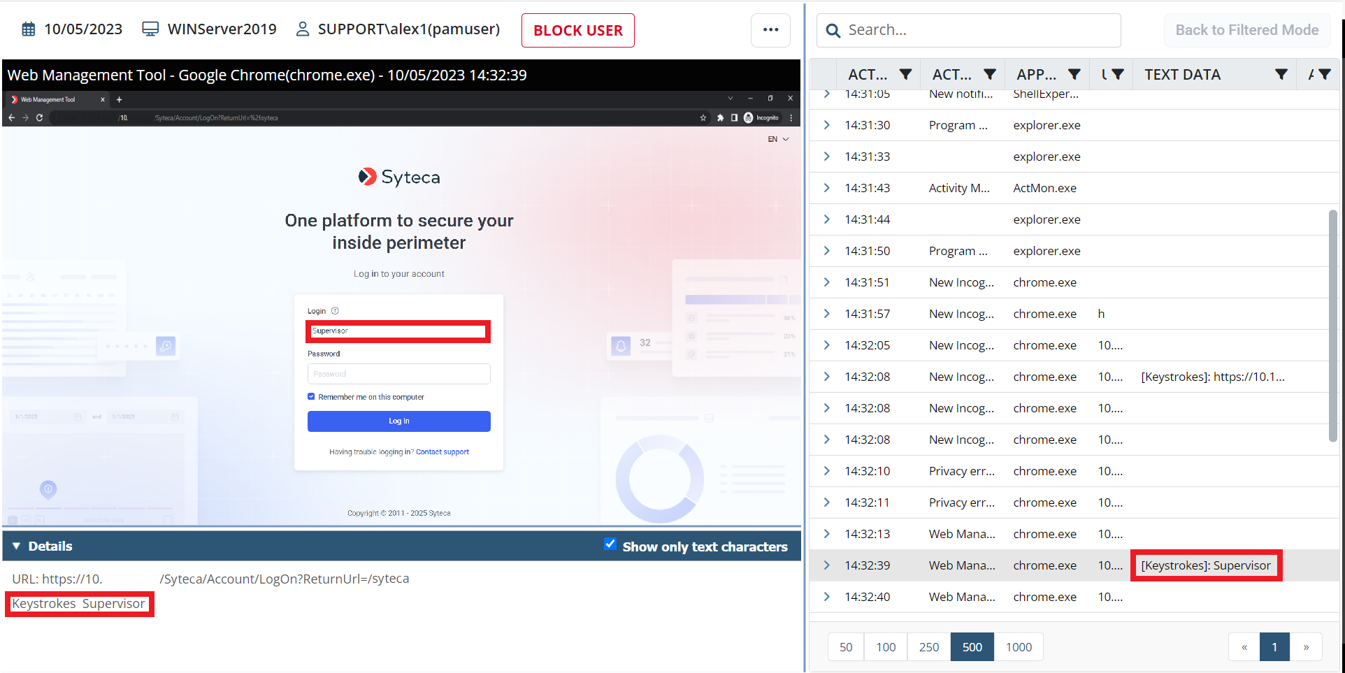 If you want to enable the displaying of keystrokes in the Session Viewer and in reports, please contact us at: https://www.syteca.com/en/support/contact-support; or send an email to: info@syteca.com