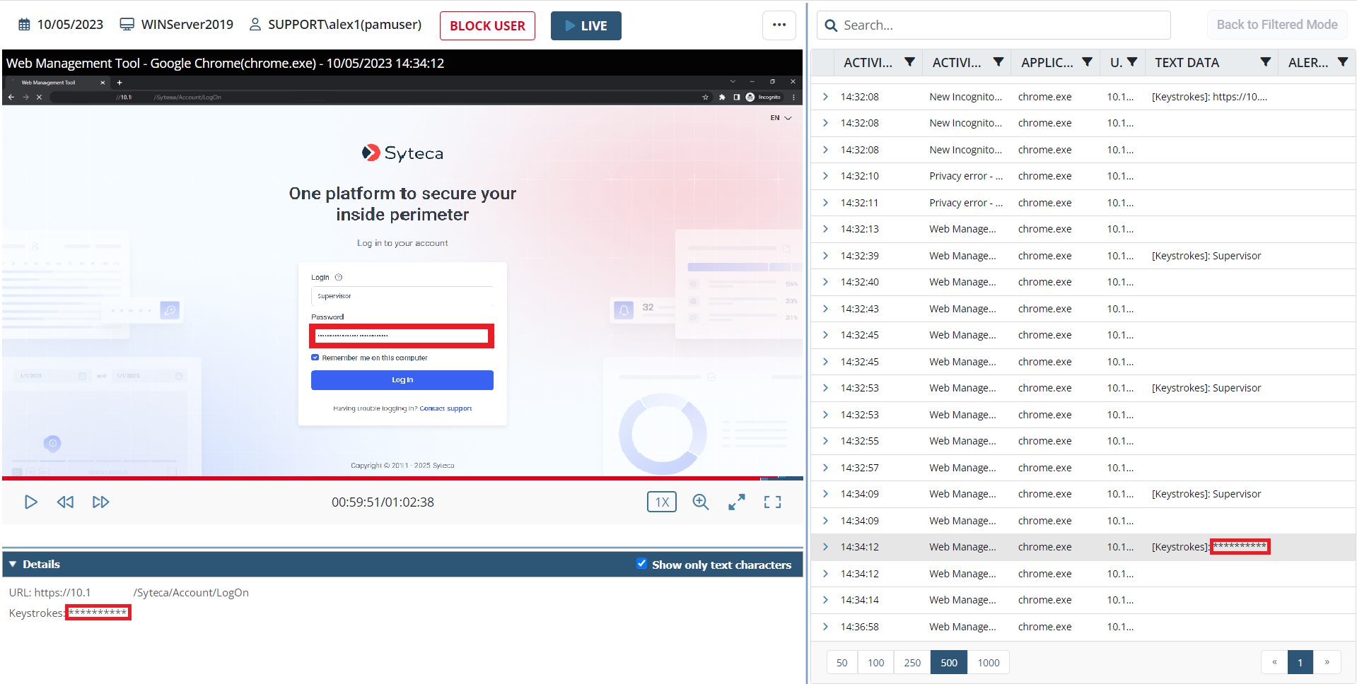 To help ensure compliance with privacy laws, standards and regulations (e.g. GDPR), all keystrokes logged are hidden in the Session Viewer and in reports, but searches can be performed on this data, and alerts can be created to be triggered when specific keywords are typed by a user.