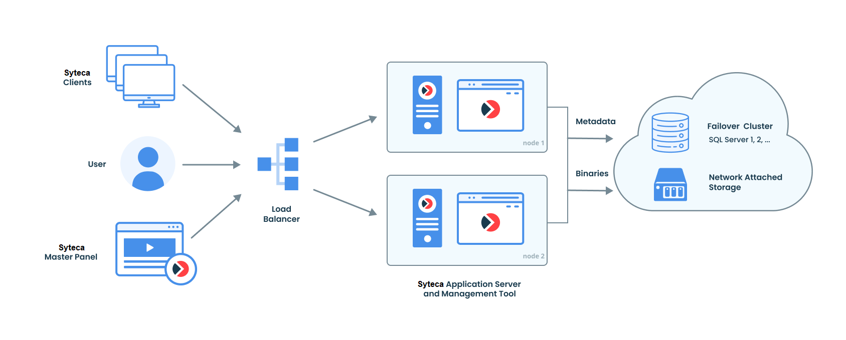 Organizations with medium-sized or large deployments of Syteca, and with a large amount of Client machines, can use load balancing in High Availability mode to continually optimize the performance of their Syteca deployments by automatically redistributing the load across the Application Server instances.