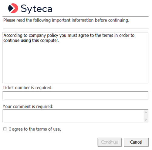 7. After entering all the required information in to the additional pop-up message window, the user is allowed to click the Continue button (which becomes active), and can then access the system (otherwise, if they click the Cancel button they will be returned to the Windows login screen).