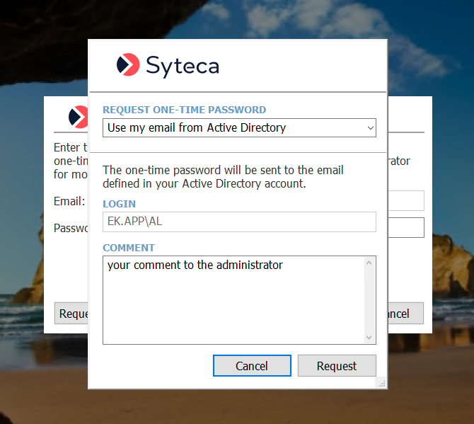 • If the Automatically send one-time passwords to Active Directory users checkbox is enabled, the following pop-up window is displayed, where the user just needs to click the Request button.