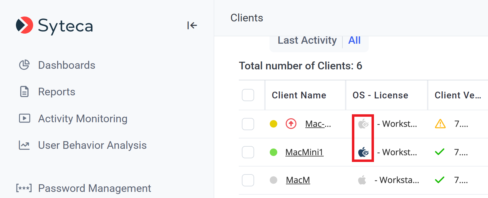 The macOS Hidden Client can be distinguished from the standard macOS Client in the Management Tool, as it has a different (