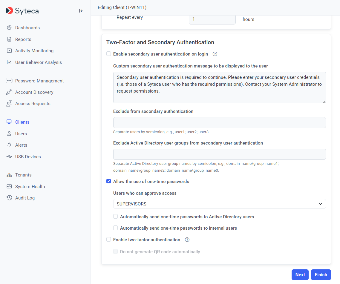 Then, on the Editing Client (or Editing Client Group) page that opens, select the Authentication Options tab, and scroll down to the Two-Factor and Secondary Authentication section, where the corresponding trusted users (i.e. Approvers) selected are displayed under the Allow the use of one-time passwords checkbox, in the Users who can approve access drop-down list.