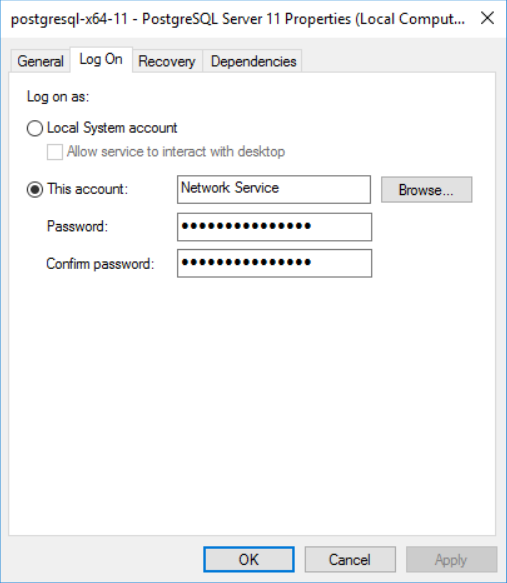 2. Open services.msc, and find the postgresql-xxx service, and then check the account under which the service is running (by way of example, the Network Service account is shown in the following screenshot).