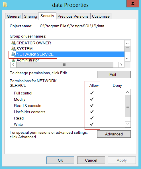 3. Create a folder on another drive in the location where you want to transfer the database to, and in the folder’s Properties, on the Security tab, add the user who will run PostgreSQL, and grant them all permissions.