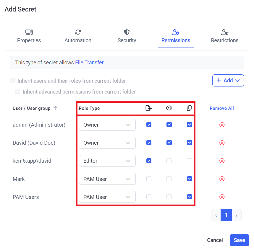 • Permissions: The Role Type permissions granted (Owner, Editor, or PAM User) to the user / user group of the secret.