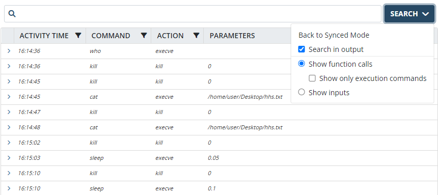 - Show only execution commands: Select this checkbox to filter the records so as to only display records containing "exec" system function calls executed (where the exact “exec” function calls are displayed in the Action column).
