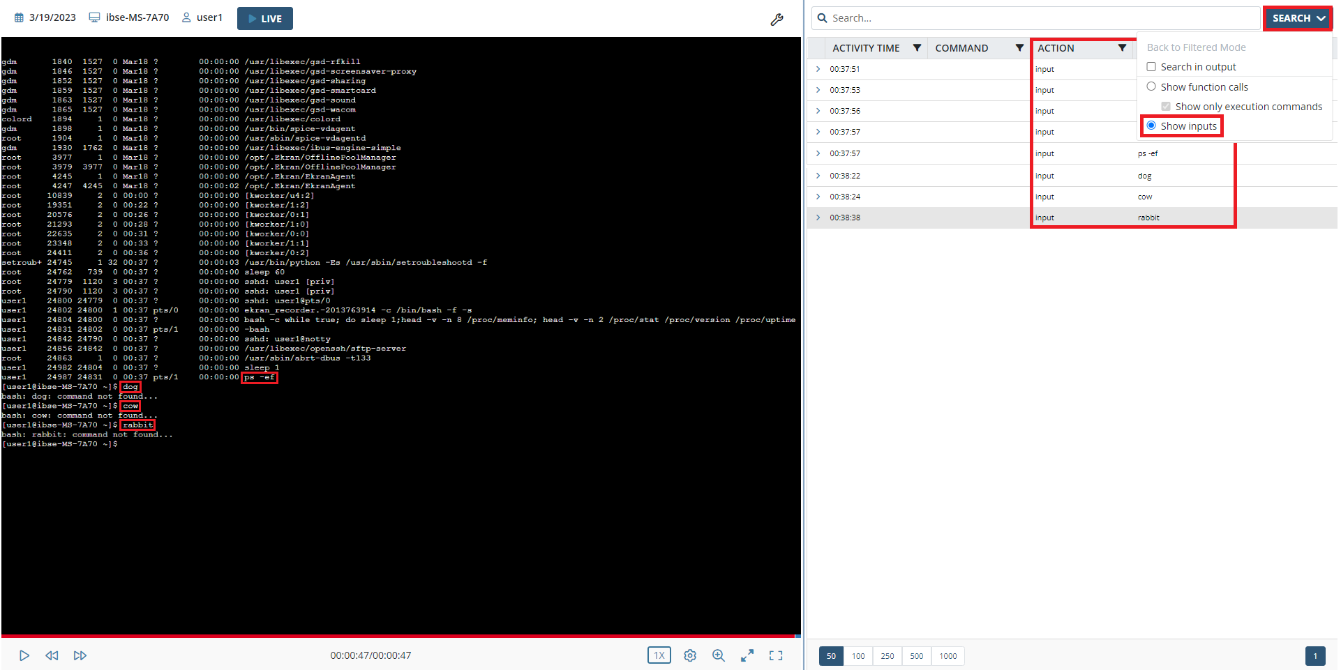 While playing Linux remote SSH sessions and local terminal sessions, all graphically recreated interactive (GUI) data can be viewed in the form of video (i.e. a series of screen captures) in the Session Player, while the associated keystrokes input by the user, commands executed with their parameters, system function calls executed, and command outputs can be viewed in the Metadata grid.