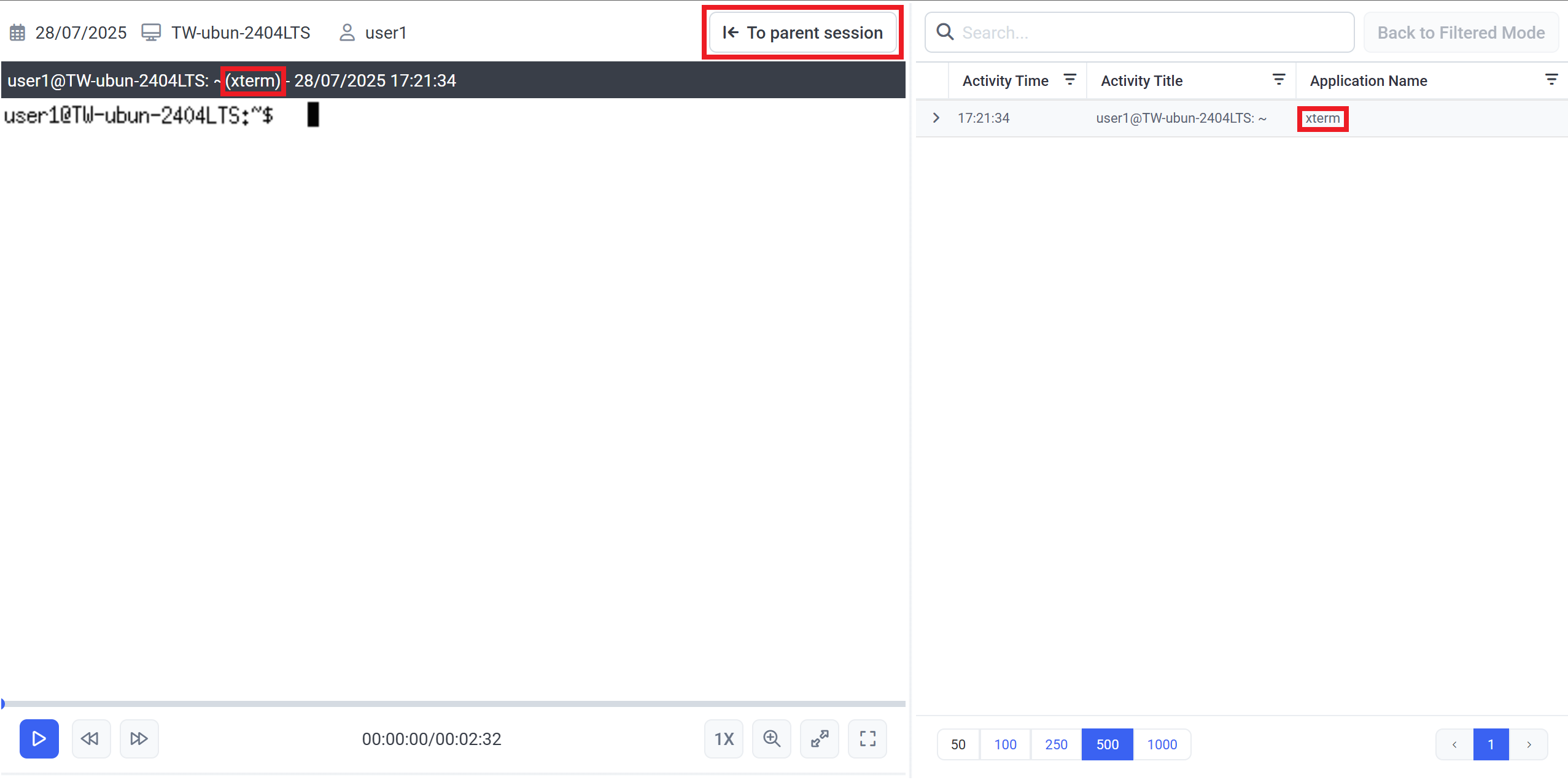NOTE: The Search box on the Activity Monitoring page can be used to find records for the required X-forwarded sessions (e.g. in this case by entering "xterm" to display all sessions for that application name).