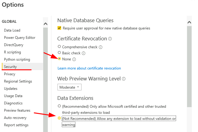 - Set the Data Extensions option to Allow any extension to load without validation for warning.