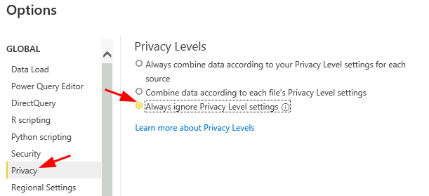 - Set the Privacy Levels option to Always ignore Privacy Level settings.