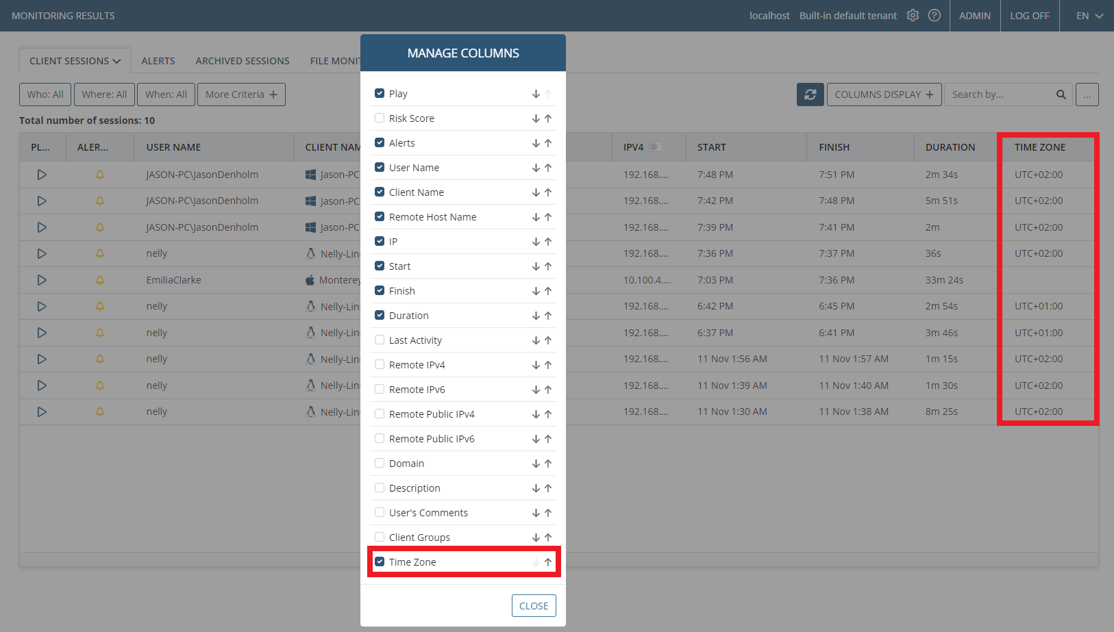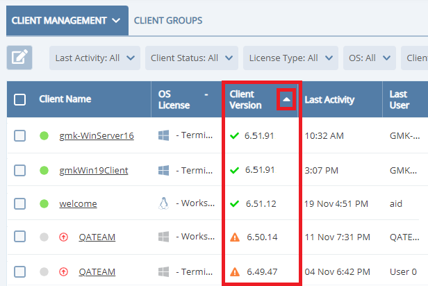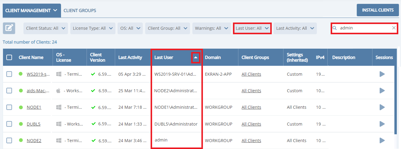 • [Viewing Client Sessions:] Sessions outside of the date range specified in (the "Between" option of) the "Last Activity" filter were displayed in the Client Sessions list - fixed.