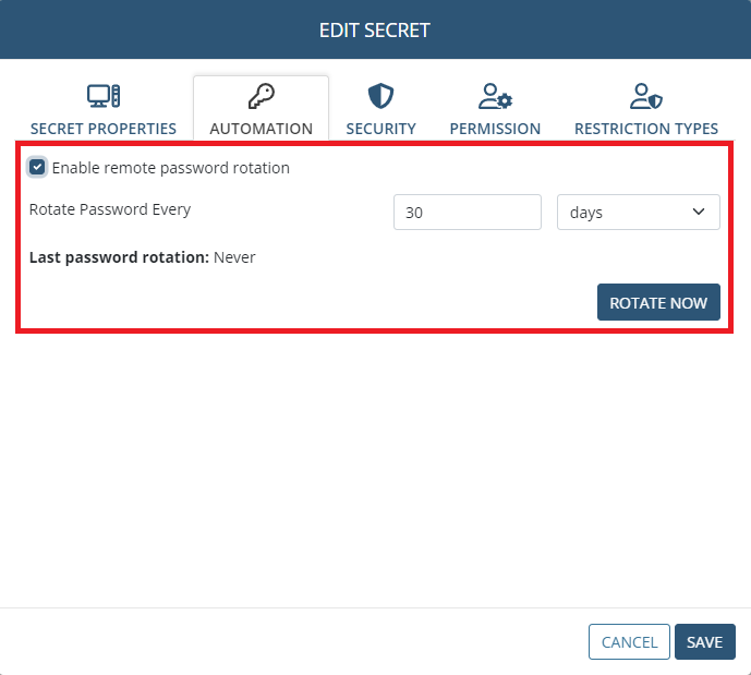 • [Account Discovery:] A secret can now be used for remote password rotation when onboarding Active Directory accounts discovered (in the same way as for Windows local and Linux accounts).