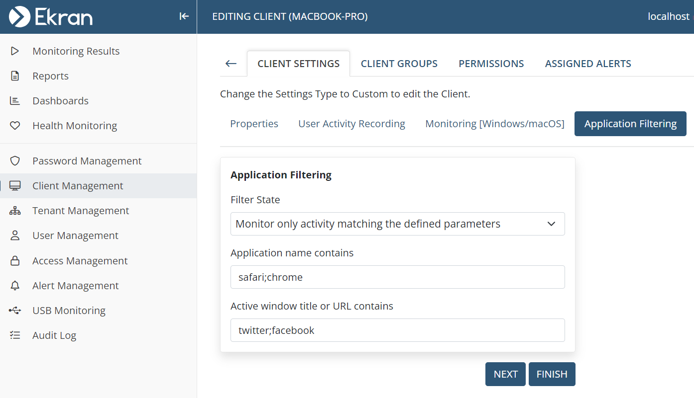• [Application Filtering:] In certain cases, Client sessions contained several screenshots of applications that were specified as not to be monitored in the Application Filtering parameters - fixed.