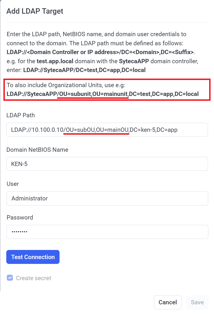 • [LDAP Targets:] LDAP Targets can now be added that are limited to an Organizational Unit (OU) within the LDAP Target domain.