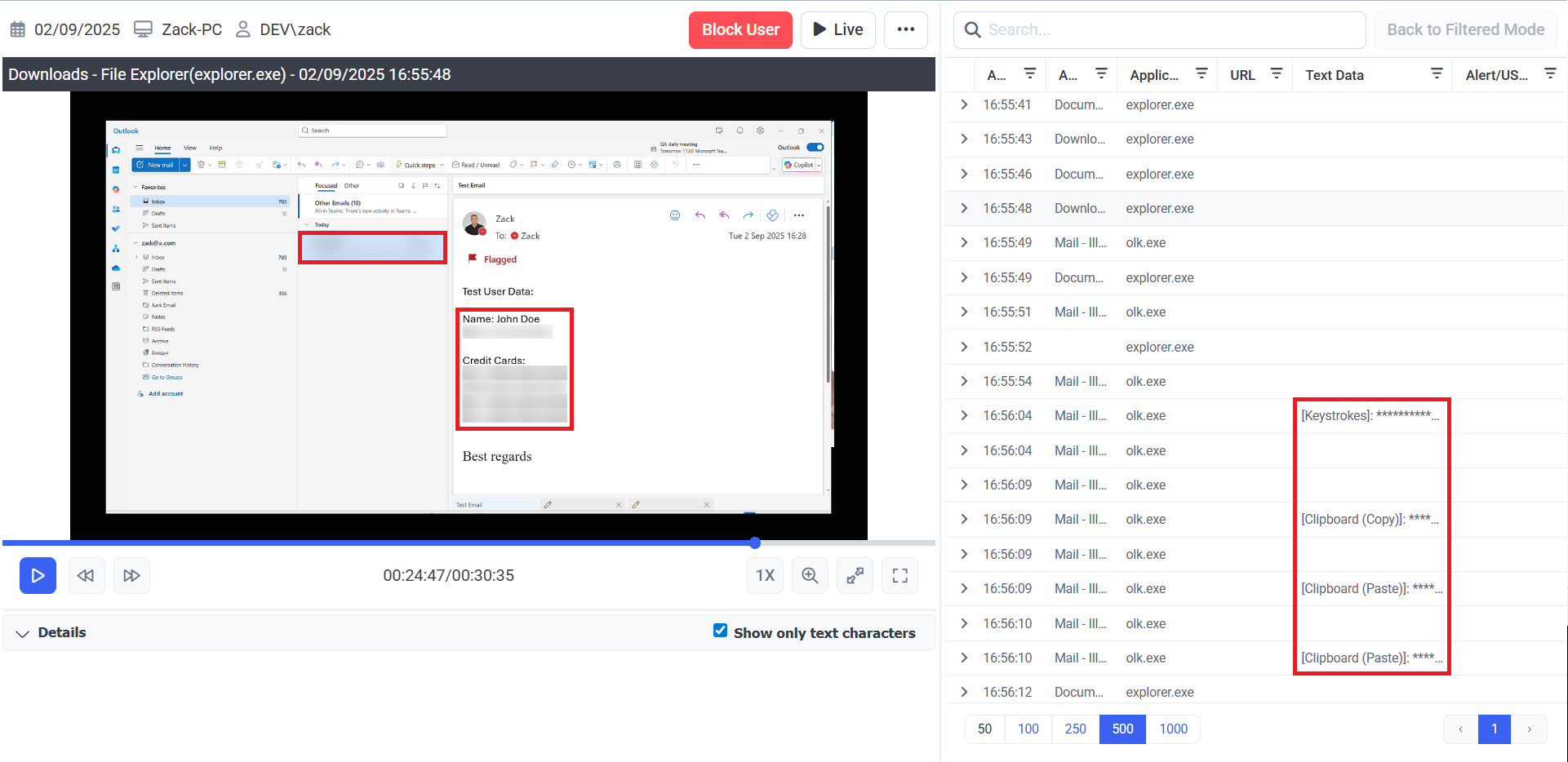 • [Monitoring Windows Clients:] The Sensitive Data Masking feature is now available to allow custom regex values to be defined so as to detect and mask sensitive clear text data (e.g. passwords, SSNs, credit card numbers, etc.) on Windows Client computers that is displayed in the Session Viewer (currently supported for: MS Word, MS Outlook (new and classic versions), Google Chrome, MS Edge, Notepad++).