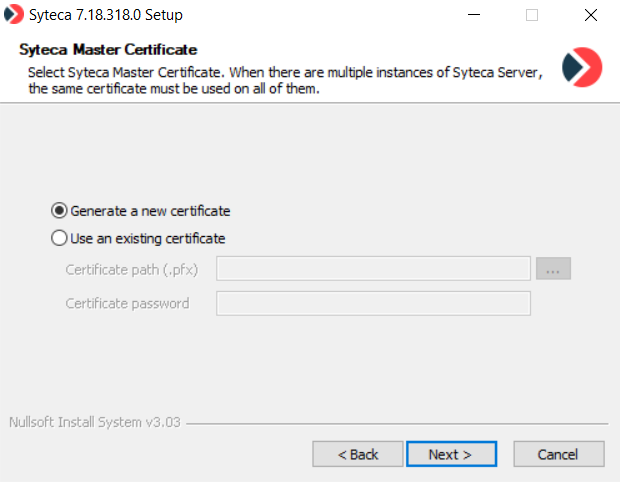 7. On the Syteca Master Certificate page, if the Application Server is being installed for the first time, select the Generate a new certificate option.