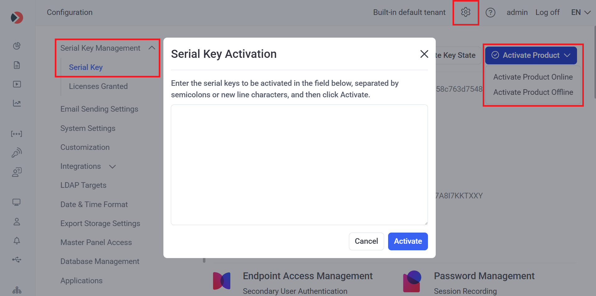 To activate the serial key, click the Configuration () button (at the top of the Management Tool interface), and on the Serial Key Management tab, on the Serial Key sub-tab that opens, click the Activate Product button (in the top right) and then select Activate Product Online (or Activate Product Offline if have an internal network without an Internet connection on the computer on which your license serial key is to be activated).