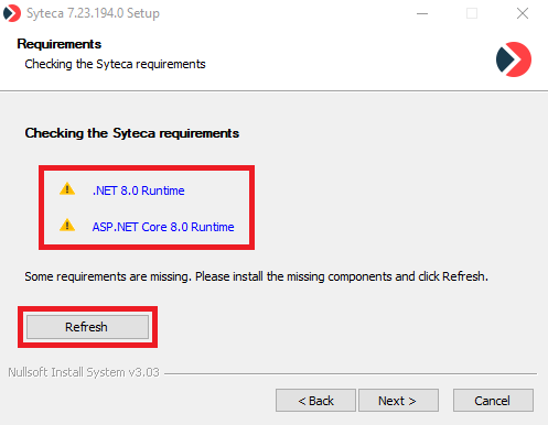 .NET 8.0 (.NET Runtime 8.0 and ASP.NET Core 8.0 Runtime) components need to be installed, which can be done while installing Syteca Application Server v. 7.23 (or higher) by clicking on the links provided on the Requirements page of the installer.