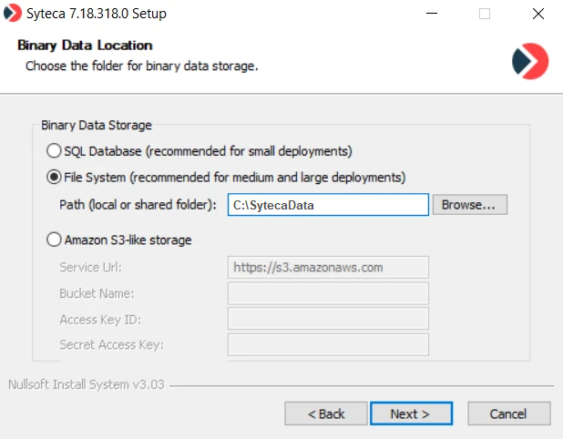 NOTE: More information can be found on the Editing the Database Parameters page, and for the "Amazon S3-like storage" option, more information can be found on the Configuring Syteca to Store Binary Data in Amazon S3 page.