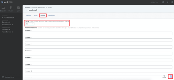 8. Select the Options tab, and then in the Priority drop-down list, make sure After is selected, and click the Save button (in the bottom right) to save the script.