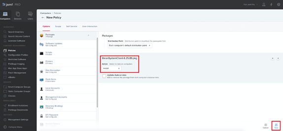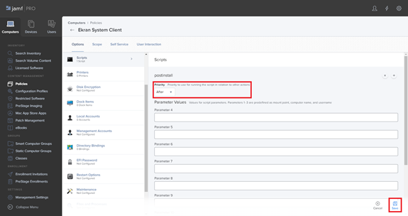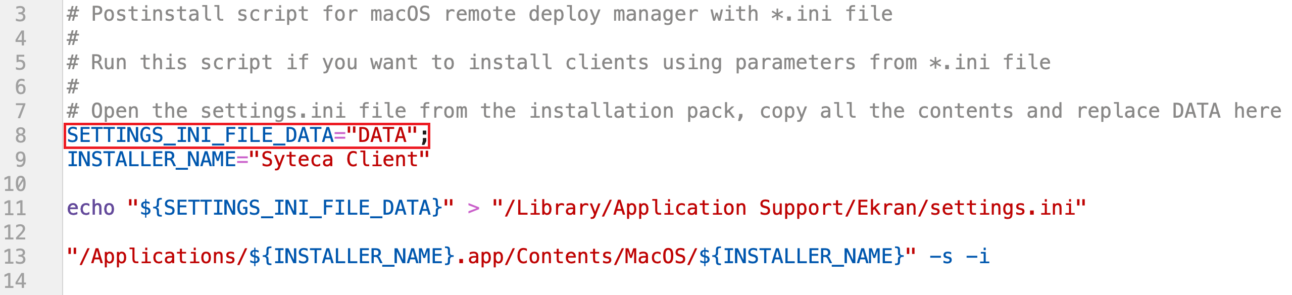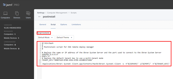 Instead, if the EkranClient folder in the macOS installation package contains a settings.ini file, copy the contents of the EkranClient/remote deploy/postinstall_ini_file_support.sh script file into the Script Contents field, and then copy the contents of the settings.ini file into the SETTINGS_INI_FILE_DATA variable to replace the DATA value in the Script Contents field, and Steps 6 and 7 (below) should then be skipped.